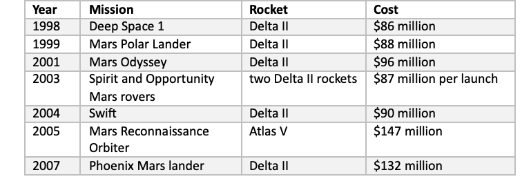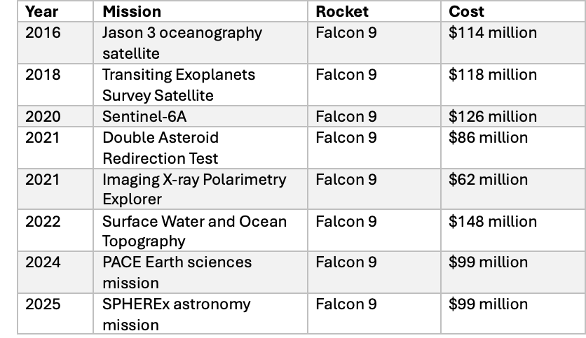 Although launch prices for every NASA mission since 1996 are not publicly accessible, launch prices paid by NASA for most medium and large science missions from the late 1990s through the mid-2000s are available open source. Today, these missions would likely launch on SpaceX Falcon 9 rockets. Below is a sample with contract values adjusted for inflation to reflect 2025 dollars: