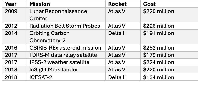 NASA mission launch prices surged after the late 2000s, following the formation of United Launch Alliance through the merger of Lockheed Martin and Boeing's Atlas and Delta rocket programs. This merger eliminated competition for most NASA launch contracts until SpaceX's Falcon 9 became available for NASA science missions in the mid-2010s. Below is a sample illustrating rising costs, with contract values adjusted for inflation to reflect 2025 dollars: