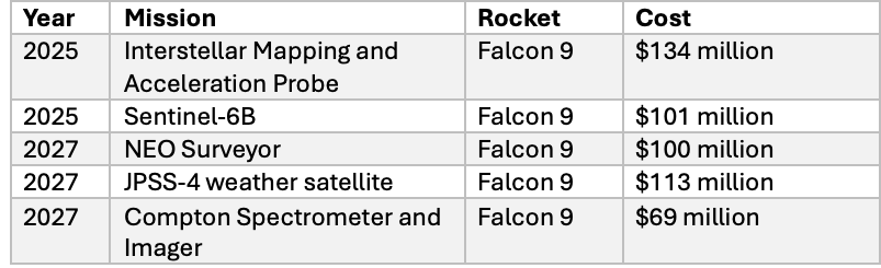 Here are a few upcoming launches NASA has scheduled with SpaceX's Falcon 9 rocket. Some of these contracts were awarded within the last year and have not been adjusted for inflation, while others reflect 2025 dollars: