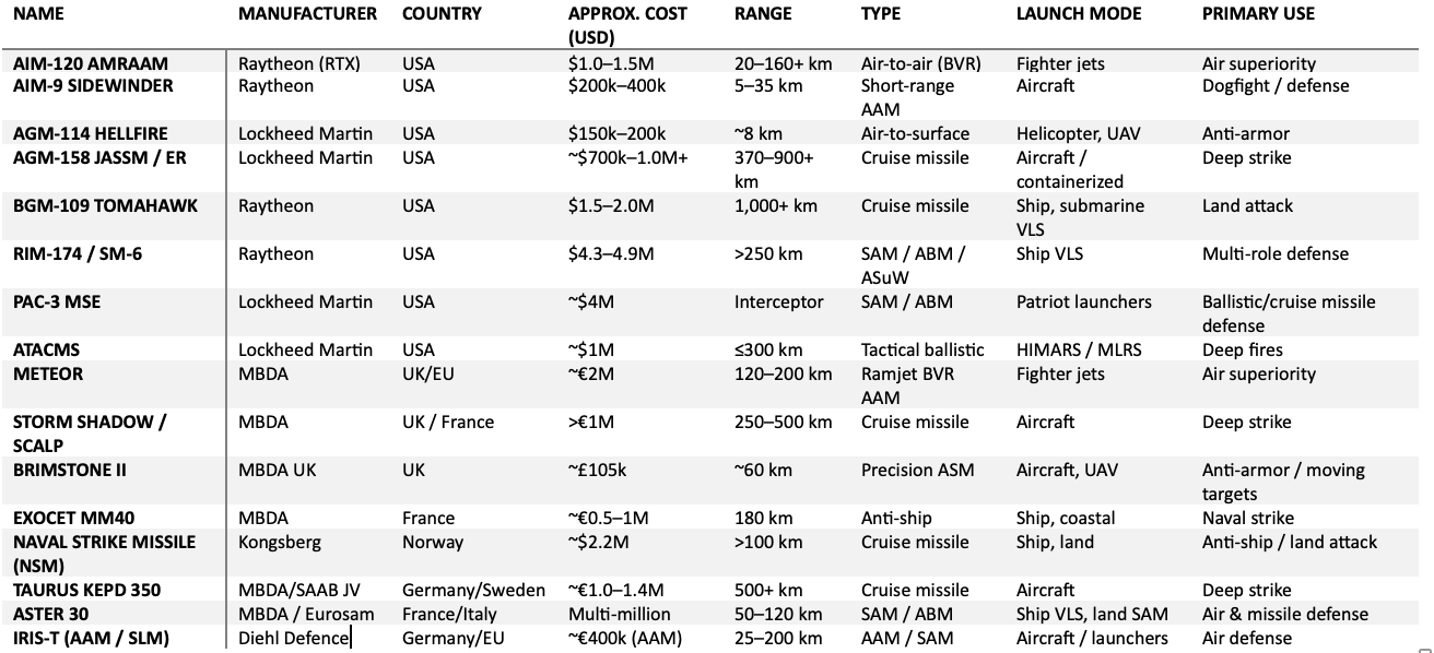 The following table highlights a set of representative U.S. and European missile systems currently in service. These missiles cover the most significant categories, from air-to-air interceptors to long-range cruise missiles and tactical ballistic systems. It includes manufacturer, country of origin, approximate unit cost, operational range, type, launch modes, and primary use. The following table demonstrates the breadth of current inventories and underscores the reliance on high-cost systems whose replacement rate lags far behind potential wartime usage