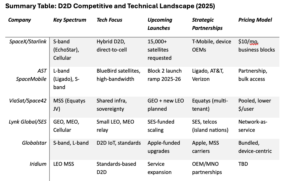 Industry consolidation (SES-Intelsat merger), competitive launches (Apple-funded Globalstar upgrades), and evolving business models point to continued fragmentation, but also to a maturing commercial ecosystem, where spectrum control, technical leadership, and sustainable economics will define the winners as D2D becomes standard in mobile handsets and enterprise networks.